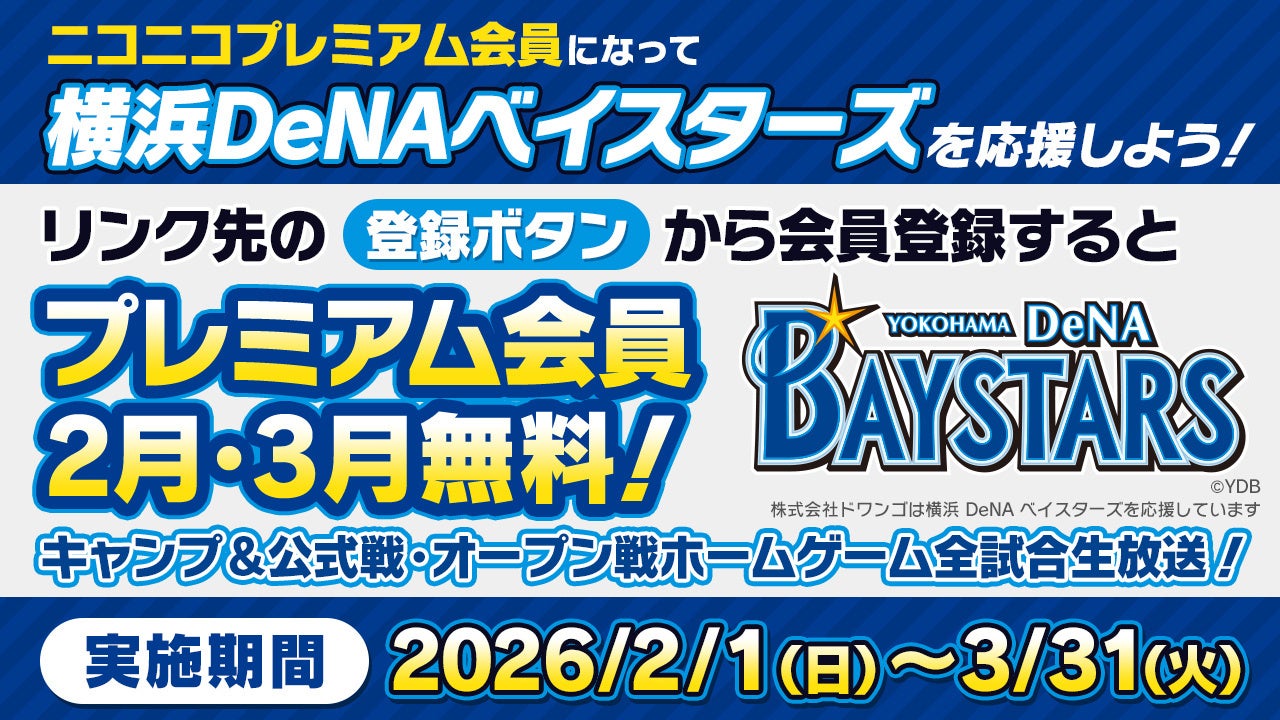 2026年もニコニコでは横浜DeNAベイスターズのホームゲームを全試合生中継!今回は公式戦開幕に先駆けて、スペシャルなキャンペーンを開催いたします!