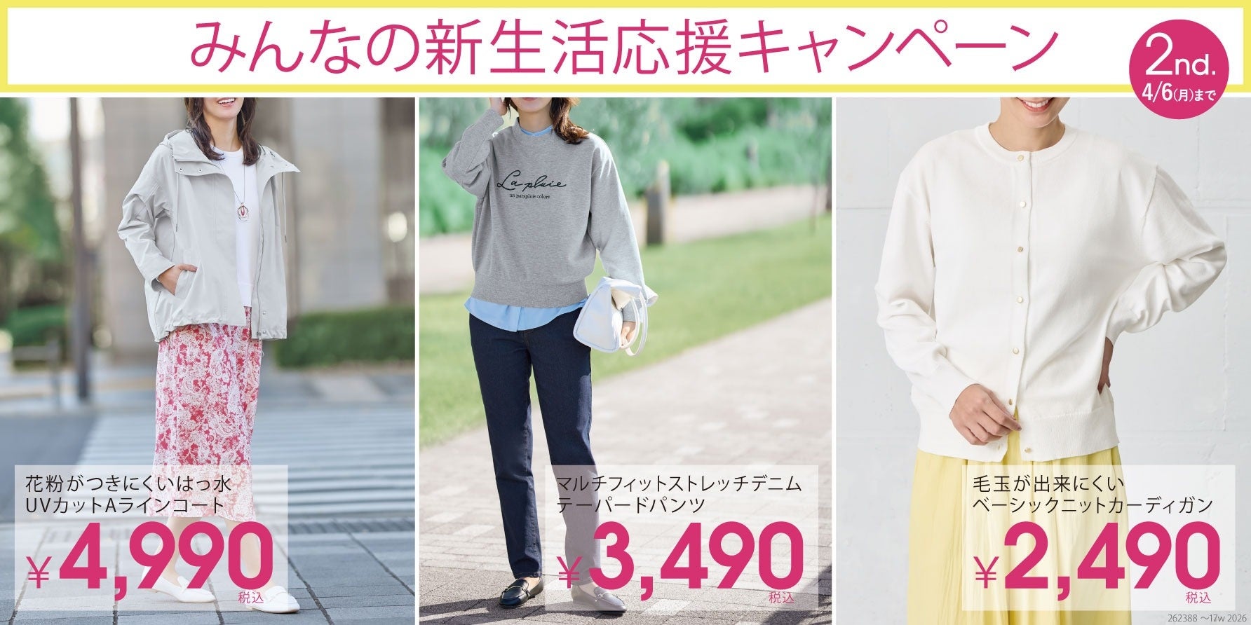 N+が展開する「みんなの新生活応援キャンペーン第2弾」では、春のお出かけに活躍する8種類のアイテムを期間限定価格でご提供いたします。UVカットや花粉が付きにくい機能を備えたアウターをはじめ、毛玉の出来にくいニットやストレッチデニム、スニーカーまで。春のお出かけから日常使いまで幅広く活躍するラインアップを取り揃えております。