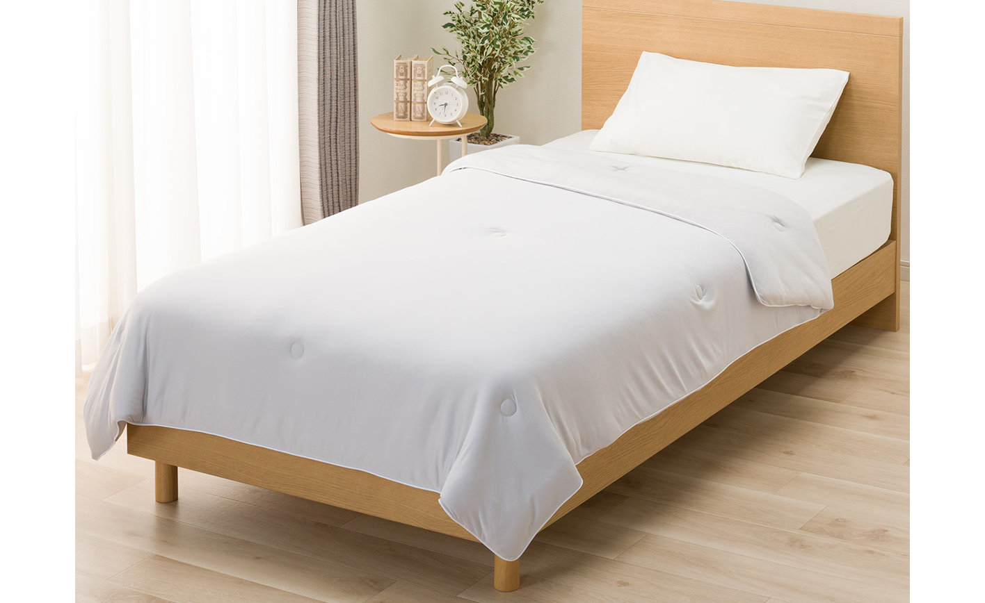 商品のこだわりポイント 1.【しっとりなめらか】生地の保湿力を追求 裏生地には、シルクとテンセルを採用。繊維そのものが水分を抱え込む性質を持っているため、乾燥が気になる季節もしっとり優しい質感で体を包み込みます。 2.【ムレずに快適】トウモロコシ由来の吸放湿わた 中綿には環境に配慮した生物基ナイロン(トウモロコシ由来)をブレンド。優れた吸放湿性で布団の中の湿度をコントロール。サラふわな寝心地が続きます。 3.【毎日清潔】天然の防臭機能&丸洗い設計 裏生地は天然素材の力を活かした抗菌防臭。薬剤に頼りすぎない衛生的な寝具です。表生地は吸水速乾性に優れたニット素材で、ご家庭で手軽に洗濯できるから、いつでも洗い立ての心地よさを味わえます。 暖房で乾燥しがちな冬から、春夏の汗ばむ季節まで、毎日の寝具を快適に整えませんか。新生活の寝具の買い替えにもおすすめです。とろけるような肌ざわりを、ぜひ店頭でお確かめください。