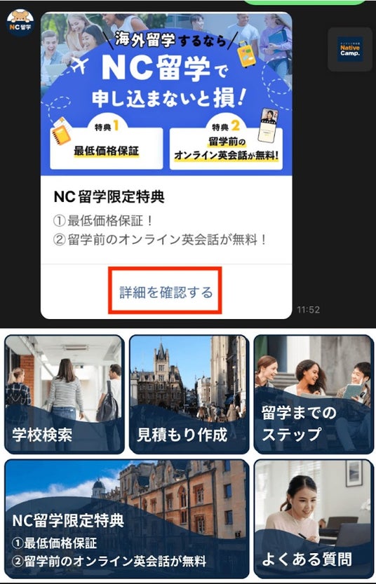「NC留学限定特典」のカードタイプメッセージの「詳細を確認する」をタップ