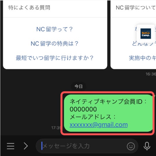支払いが完了した後はネイティブキャンプ留学 公式LINEに下記の情報を送信