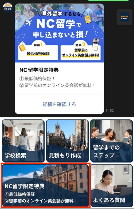 リッチメニュー内の「NC留学限定特典」をタップ