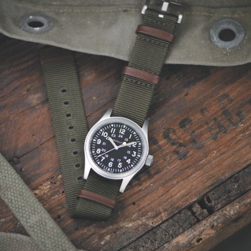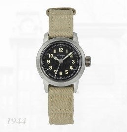 ミリタリーウォッチ グレードII(1944)1940年代以降アメリカ軍の兵士が標準装備として身に着けていた軍用腕時計のひとつ。ミルスペック(軍の調達規格)を満たす。ハミルトンのミリタリーウォッチの歴史を紡ぐ「カーキ フィールド」の原型ともいえる貴重な1本。