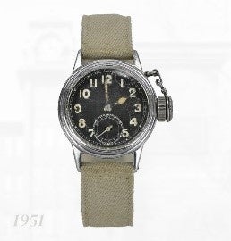 キャンティーン ダイバー(1951)アメリカ海軍の特殊部隊、水中爆破チームUDTに採用された防水時計。リューズを密閉するためのチェーン付きリューズキャップを備える。優れた防水技術は、現行のマリンウォッチ「カーキ ネイビー」コレクションにも継承されている。