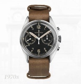 クロノグラフ ファブフォー(1970's)英国空軍のパイロット用クロノグラフ。ハミルトンを含め4ブランドが軍に供給していたため、ビートルズの愛称“Fabulous Four=素敵な4人組” に因み、“ファブフォー”と呼ばれる。そのスピリットは「カーキ パイロット パイオニア」に引き継がれている。
