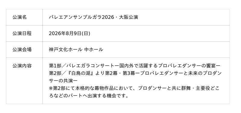 【バレエアンサンブルガラ2026・関西公演】共演ダンサー募集のお知らせ!集まれ!未来のプロダンサー!夏の特別舞台で、国内外で活躍するプロダンサーと同じ舞台に立つ─感動の経験をお届けします。