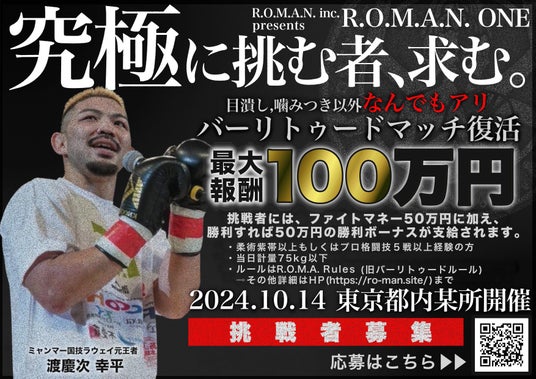 ROMAN株式会社(本社:神奈川県鎌倉市、代表取締役CEO:渡辺直由)は、2024年10月14日に開催する格闘技団体ROMANの旗揚げ大会「ROMAN ONE(ローマン ワン)」の開催にあたり、ミャンマーの国技ラウェイ元王者である渡慶次幸平選手の対戦相手を募集いたします。最大報酬は100万円となり、対戦ルールは「R.O.M.A.Rules」で行われます。このルールは目潰しや噛みつきを除き、ほぼ全ての技が認められる、かつてのバーリトゥードルールに基づくものです。