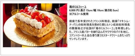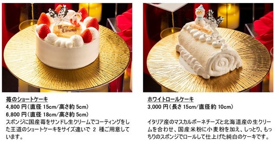 2024年のクリスマスケーキは新登場となる「シャインマスカットのショートケーキ」とマスカルポーネクリームを白いスポンジでロールした「ホワイトロールケーキ」を加えた全5種をご用意しております。上品な甘みと香り、ジューシーな果肉が特長のシャインマスカットをトッピングし、たっぷりの生クリームでデコレーションした「シャインマスカットのショートケーキ」はワンランク上のクリスマスを演出します。苺をふんだんに使用した毎年人気の「苺のショートケーキ」は直径15cmと18cmの2サイズでご用意しており、少人数から大人数までお楽しみいただけます。また銀座「マキシム・ド・パリ」の3代目料理長を務めた、斎藤裕之が監修した名作「苺のミルフィーユ」はヒルトン成田においても長年の人気商品です。