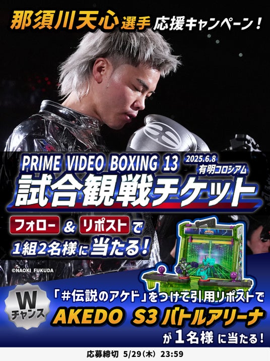 【プレゼント賞品/詳細】 ▪︎『Prime Video Boxing 13』 試合観戦チケット 1組 2名様 AKEDO公式X(旧Twitter)アカウント「@akedo_japan」をフォローの上、