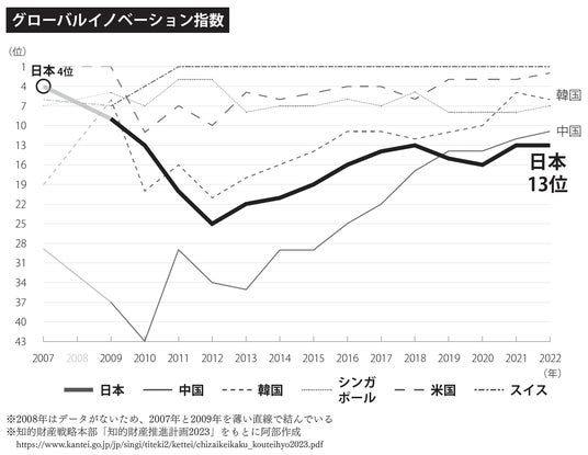 WIPO(世界知的所有権機関)が発表するグローバルイノベーション指数において、日本は2007年の4位から、2012年には25位にまで転落。その後緩やかに順位を上げつつも、韓国や中国に追い抜かれています。経済産業省が策定した「未来人材ビジョン」においても、国際競争力の低下、世界最低水準の従業員エンゲージメント、海外志向人材の減少などの現状が危惧されています。