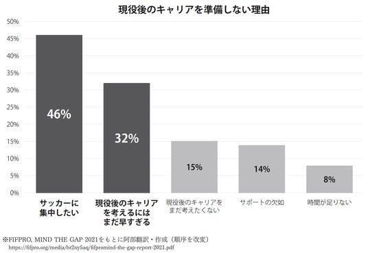 FIFPRO(国際プロサッカー選手会)が発表する“MIND THE GAP 2021”の統計によれば、現役プレーヤーのうち、将来の計画に自信を持っているのはわずか33%。また、引退後のキャリアの準備をしない理由として多くの選手が挙げたのは「サッカーに集中したい」「現役後のキャリアを考えるにはまだ早すぎる」でした。