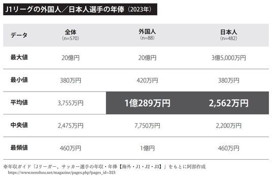 2023年のJ1選手の平均年俸は「3,755万円」というデータがありますが、ここには高額の年俸をもらう外国人選手(平均1億289万円)も含まれています。日本人選手だけで見た場合、平均年俸は「2,562万円」にまで下がります。
