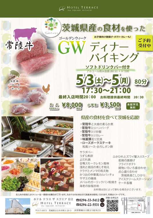 ホテルテラスザスクエア日立(所在地:茨城県日立市幸町1-20-3、副総支配人:城戸康)では、今年のゴールデンウィーク中5月3日(土)~5月5日(月)の3日間、に、バイキングを開催いたします。ご家族・ご友人と一緒に美味しくて楽しい時をお過ごしください。  日にち:2025年5月3日(土)~5日(月) 3日間