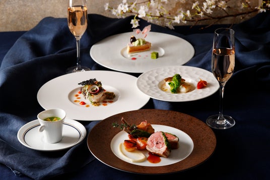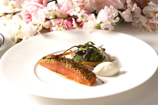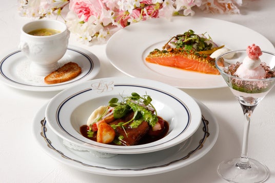 ランチでは、柔らかくしっとりとした食感に仕上げた色鮮やかなサーモンや、旬のホワイトアスパラガスをレモンバターソースで仕上げた前菜のほか、なめらかな口どけの桜香るブランマンジェにほろ苦い抹茶ソースを合わせたデザートなど、前菜3種、メインディッシュ4種からお選びいただくプリフィックススタイルにてお楽しみいただけます。ディナーでは、綺麗なグリーンが映えるグリーンピースのスープに始まり、春に美味しい食材をふんだんに使用したメニュー、桜風味の濃厚なベイクドチーズケーキを和テイストに仕上げたデザートなど、華やかな春ならではの味覚をご堪能いただけます。春爛漫を華やかに表現した、門出のお祝いにふさわしい美食メニューの数々です。豪華客船をイメージした優雅な雰囲気の店内で、新たな旅立ちを祝うお食事のひとときをいかがでしょうか。