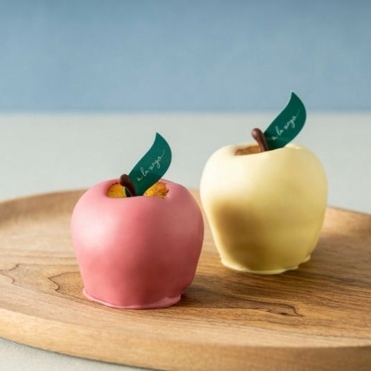 青森県産のセミドライりんごをふんだんに使用し、しっとりとした生地に焼き上げました。りんごの優しい甘さと食感が楽しめるケーキに、2種類の特別なチョコレート(ルビー・ホワイト)をコーティングしました。