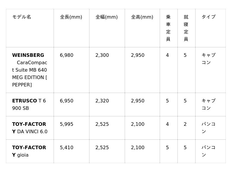 「バンコン」や「キャブコン」など様々なタイプや、大きさ・形状によって走行性能も変わります。