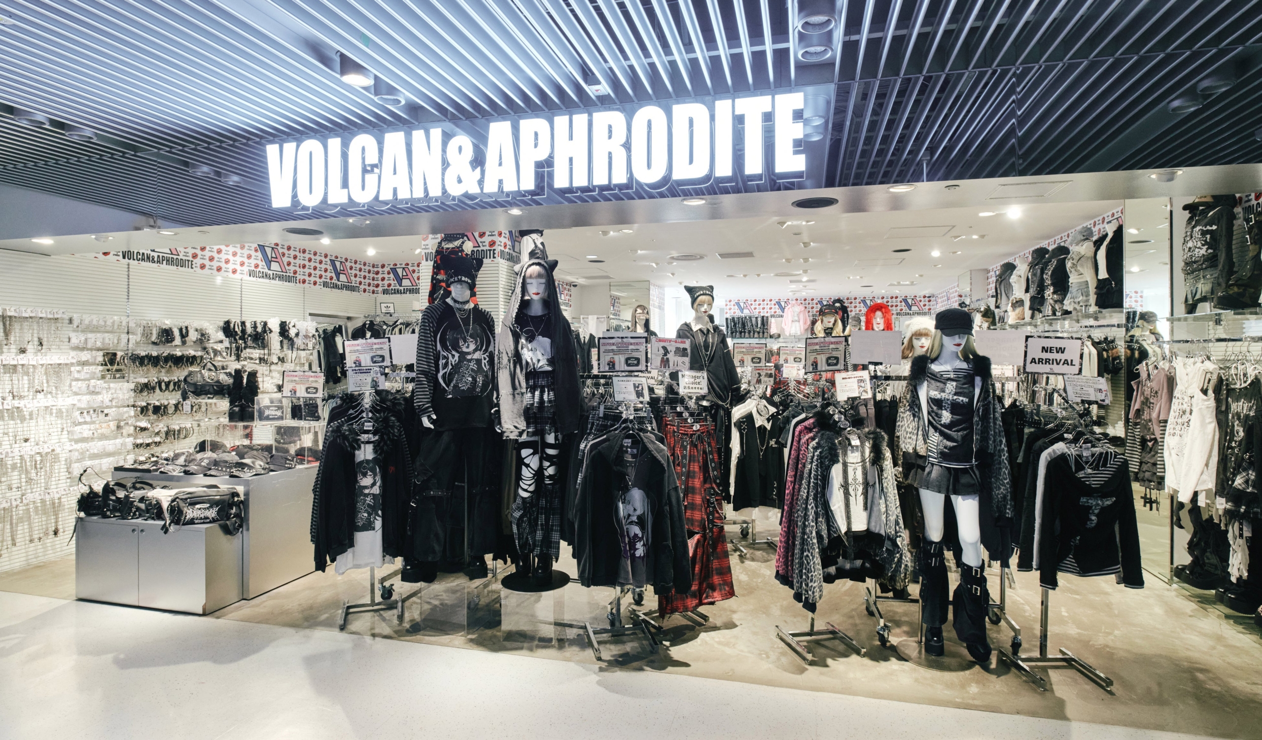 サブカル・ストリート・Y2K・地雷など、流行りを取り入れつつも”ジャンルに囚われていない”VOLCAN&APHRODITEならではの魅力が詰まった店内になりました。ジャンルレスなスタッフがお客様一人ひとりに合ったコーディネートをご提案し、楽しいお買い物のお手伝いができればと思っています。