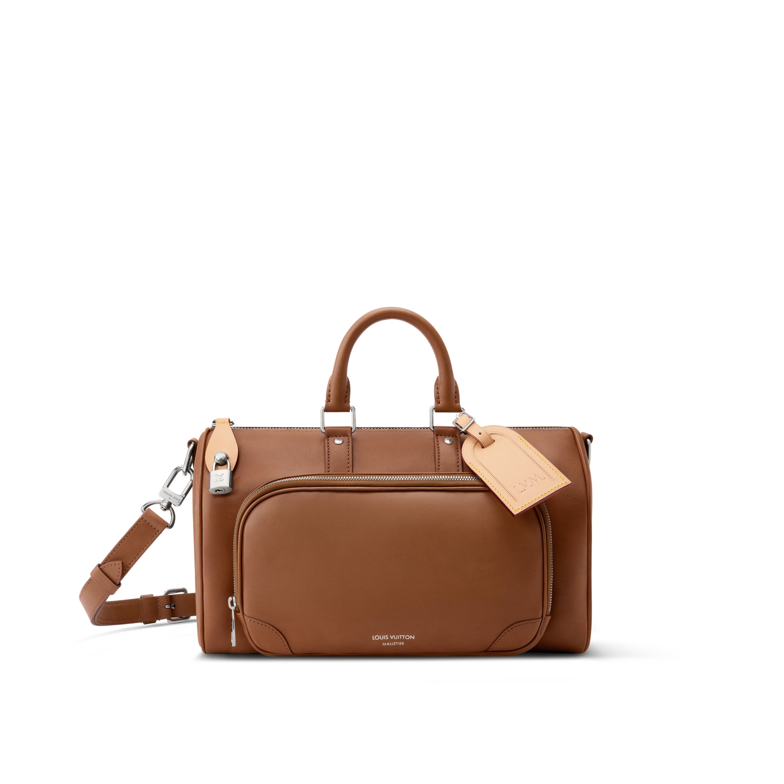 軽くドラム加工された非常に柔らかいカーフレザーで施された「キーポル・カーゴ バンドリエール 35」。実用性に優れたファスナー式フロントポケットが特徴です。ネームタグとファスナー引き手はメゾンの定番のヌメ革で仕上げました。ジャカードのライニングが洗練された印象をプラス。手に馴染むトップハンドルと取外しや調節が可能なストラップにより、持ち運びも自在です。