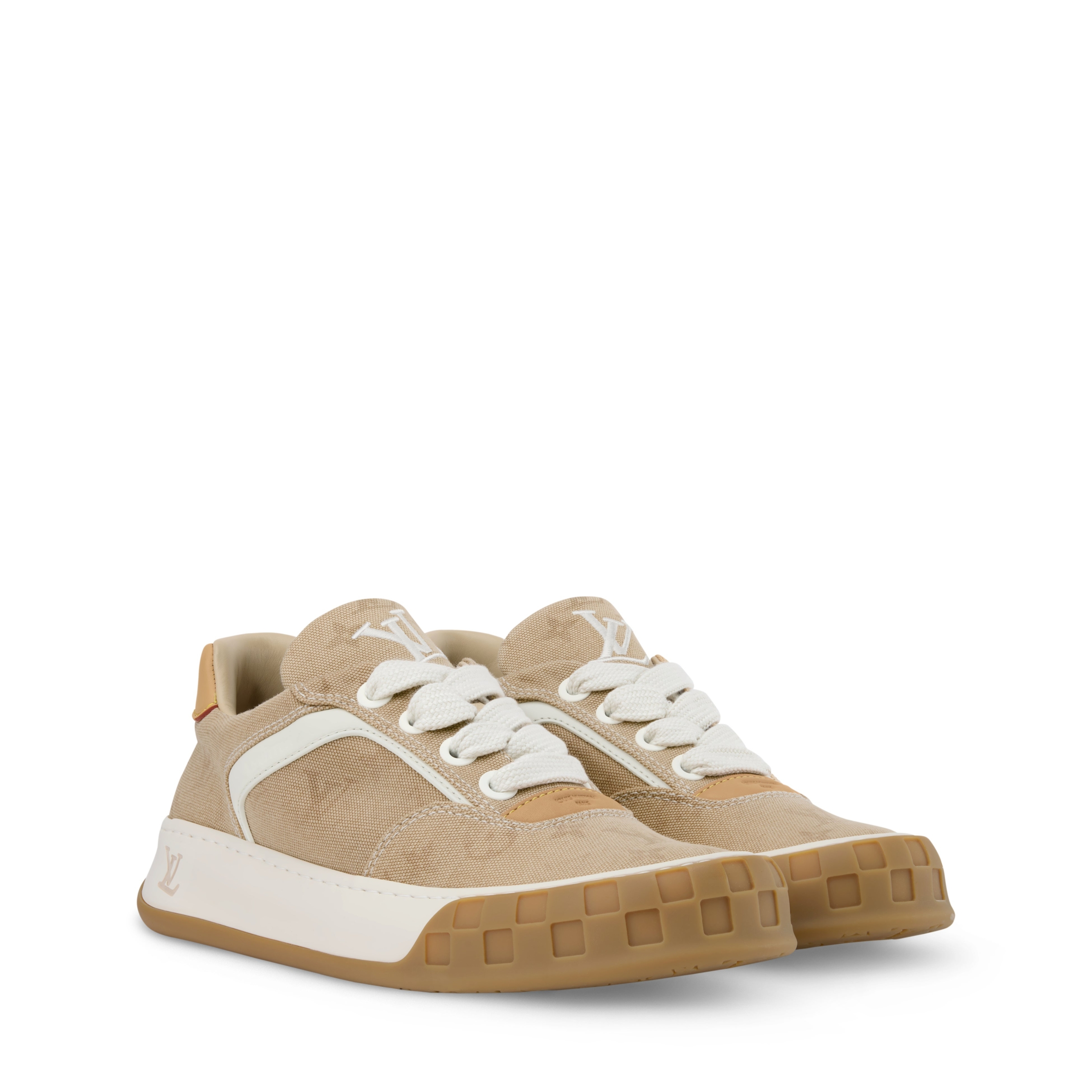 デニムにさりげなくモノグラム・パターンをあしらった「LV ティルテッド スニーカー」。メゾンを象徴するヌメ革のトリミングが、2000年代初頭のスニーカーから着想を得たデザインを引き立てます。シュータンとアウトソールを彩る傾斜したLV イニシャル シグネチャーにちなんで名付けられた1足で、アウトソールの前面に配したダミエ・パターンが特徴です。