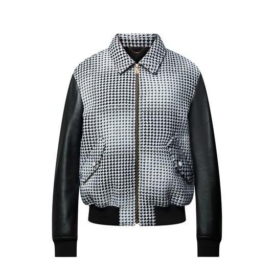 今コレクションの犬を連れたダンディな飼い主の姿から着想を得た英国のサートリアル(仕立て)風のエレガンスを、現代的にアレンジしたレザー & ウールのブルゾン。犬の頭部とLV シグネチャーを、グラデーションを描くグラフィカルなモチーフに組み込んだ、遊び心溢れるLV ドッグハウンドトゥース ジャカードがボディを彩ります。しなやかなラムレザーの両袖にはわずかにパッド加工を施し、背面には「Marque L.Vuitton Deposee」のレザーラベルをあしらいました。