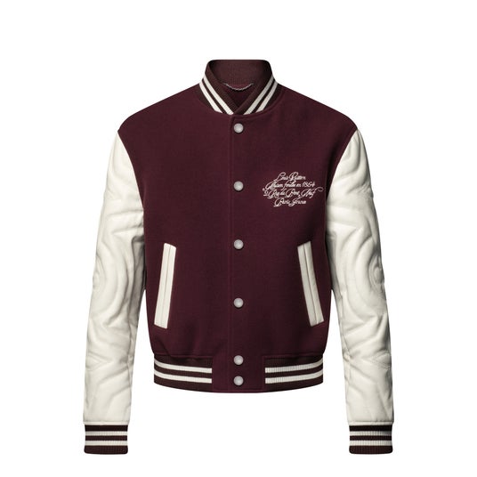 アイコニックなバーシティジャケット。モノグラム・シグネチャーを組み込んでからキルティング加工を施して立体感を生み出した、洗練されたカーフレザーの両袖で再解釈しました。ワインレッドのウールのボディに、パール調のボタンがシックなアクセントをプラス。胸元には手描き風のメゾンのシグネチャーの繊細な刺繍があしらわれています。あらゆる装いを引き立てるエレガントでプレッピーな1着です。