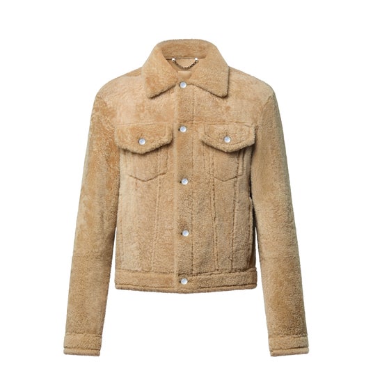 肌触りのよいシアリングでラグジュアリーなひねりを加え、多彩に楽しめるベージュで仕上げた定番のトラッカージャケット。襟下とウエストの内側、袖口とポケットには柔らかいナッパレザーを使用し、エンボス加工したモノグラムのディテールで飾りました。「Louis Vuitton」シグネチャーを刻印したパール調のボタンと、背面にあしらった「Marque L.Vuitton Deposee」のレザーラベルがシックな雰囲気を添えます。