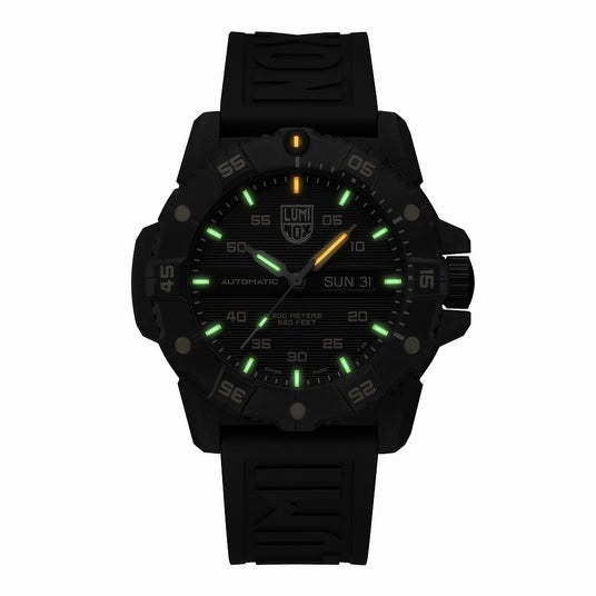 ルミノックスの特徴である頑丈なデザインを際立たせる45mmのCARBONOX(TM)+ ケースは、独自のロングバーカーボンファイバーコンパウンド (チタンの 3 倍の軽さ)、防水性とテクスチャ加工されたグラファイト仕上げによる頑丈な作り。316Lステンレススティールベゼルとの組み合わせはオフィスでもアウトドアなどでも優れた性能を発揮する自動巻き時計と言えるでしょう。
