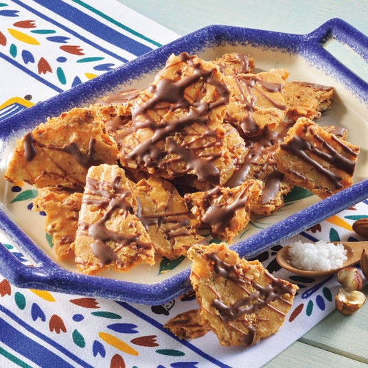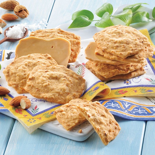 砕いたアーモンドと「ゲランドの塩」、ラム酒を入れた生地を焼き上げ、片面にキャラメルチョコレートをコーティングしました。薄焼きサブレのさくっとほろっとした食感と、甘さと塩味の絶妙なバランスをお楽しみください。