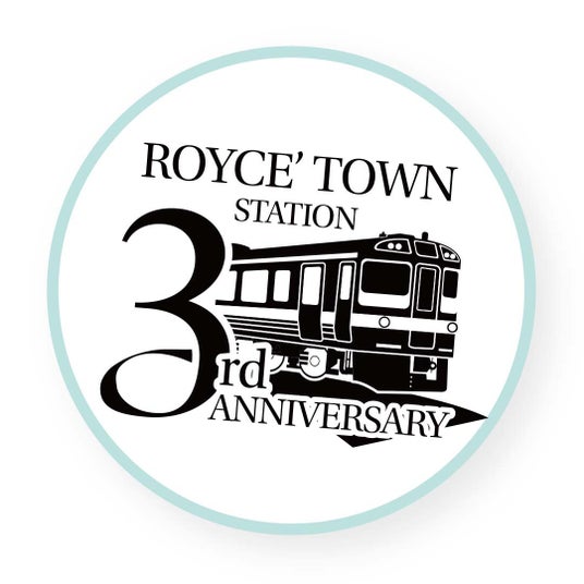 ロイズタウン駅3周年記念デザインの直径約8cmのスタンプです。記念に押してお持ち帰りください。