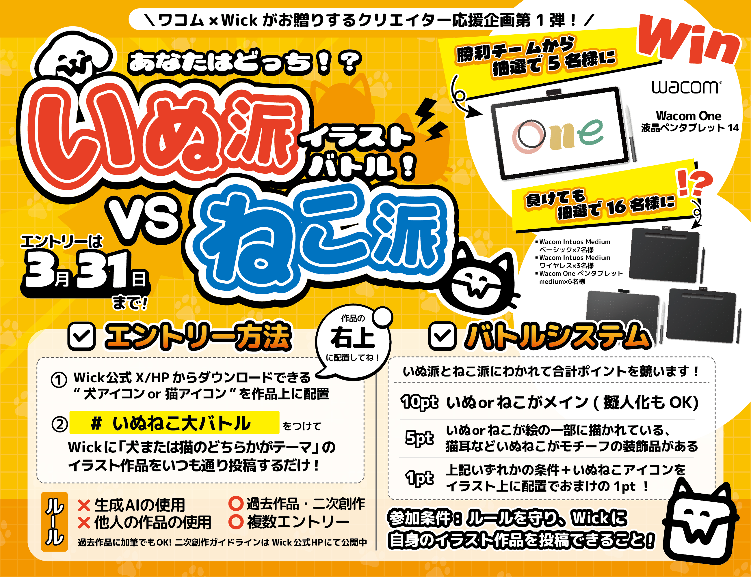 【ワコム × Wickコラボ】抽選でワコム商品が当たる!クリエイター応援企画「いぬ派VSねこ派イラストバトル」開催のお知らせ