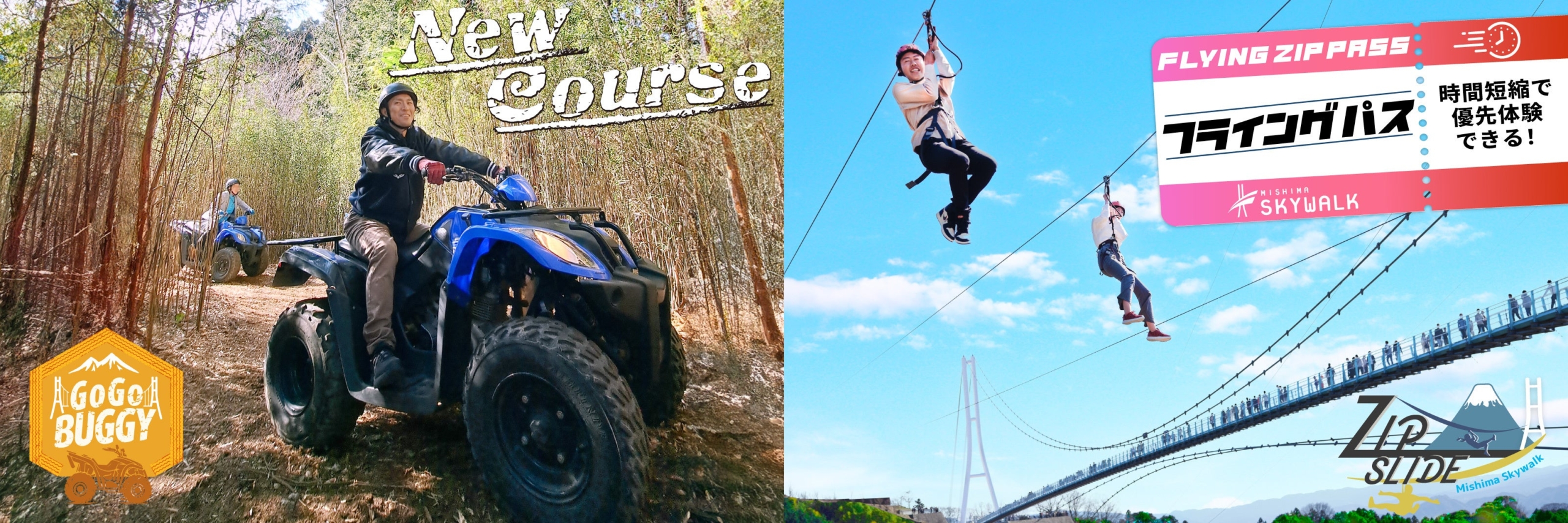 三島スカイウォークは、“絶景と発散。”をコンセプトに、つり橋からの絶景と、気持ちをめいっぱい発散できる体験型アクティビティを提供しています。このたび、2025年12月の開業10周年を記念した周年事業の一環として、春の暖かい気候の中で満喫いただけるような人気アクティビティをアップデートします。 今回は、森の中のオフロードを駆け抜ける爽快感で毎週末ほぼ予約枠が埋まるほどの人気の「ゴーゴーバギー」に、これまでとは異なる景観や地形を楽しめる新コースが登場します。木々に囲まれた森の中の大きな段差や木の根などのデコボコの地形を豪快に乗り越えるこれまでのコースに加え、新コースでは、背丈より少し高い笹に囲まれた道を走ります。笹の合間から空や周りの景色がほどよく開けることで、これまでとは違った開放感あふれる体験をお届けします。また、新コースでも富士山を望むビュースポットから、絶景をお楽しみいただけます。 そして、往復560mの空中滑走を楽しめる「ロングジップスライド」には、優先的に体験できる「フライングパス」が新たに登場します。専用ルートでのご案内で優先的に安全講習等を受けることができ、よりスムーズにアクティビティをお楽しみいただけるほか、移動時間や他アクティビティの予定に合わせて、限られた滞在時間を有効に活用できるなど、柔軟な過ごし方にも対応します。 さらに、自然豊かな北エリアの森をガイドとともに巡るアクティビティ「セグウェイガイドツアー」では、お客様の声にお応えし、対象年齢を65歳までに拡充しました。これまでより幅広い世代のお客様に参加いただけるようになり、ご家族やグループでの利用もしやすくなります。 三島スカイウォークは“絶景と発散。”を掲げ、富士山を望む大自然の中で気持ちを発散できる非日常のアクティビティを体験できる施設として、今後もさらなる魅力づくりに取り組んでまいります。