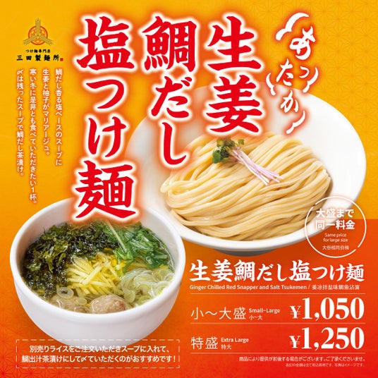 生姜鯛だし塩つけ麺・・・1,050円三田製麺所定番の味「鯛だし塩つけ麺」に、生姜香るつけ麺「あったか生姜鯛だし塩つけ麺」が加わります。