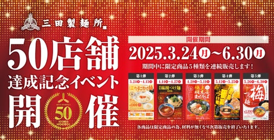 【三田製麺所】3月24日(月)より50店舗記念の限定5商品を約3か月間、入れ替え販売