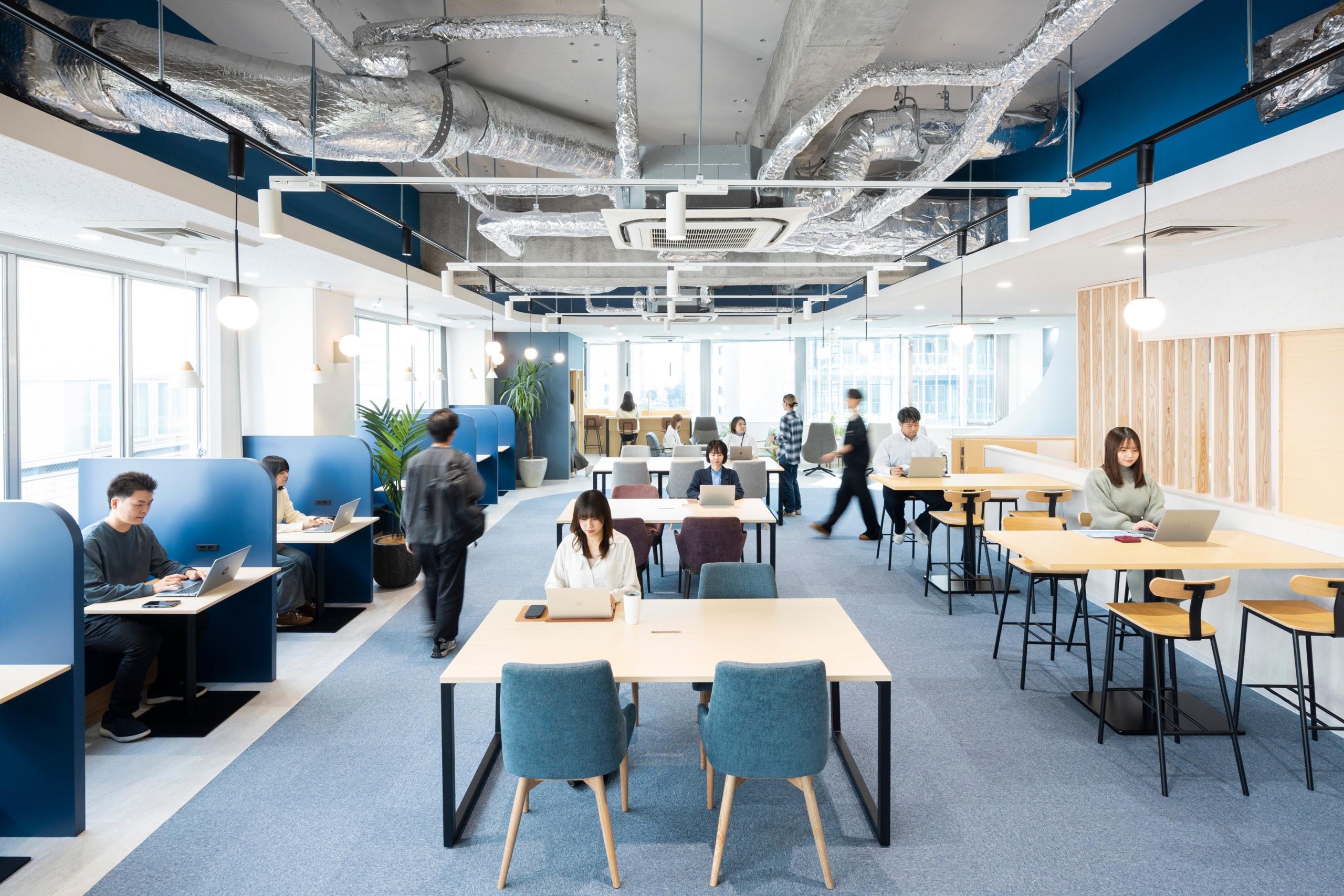 開放感あふれる爽やかなコワーキングスペース。ここちよく集中できる空間設計となっています。お困りごとがあれば、気軽に受付スタッフへお声がけください。(Zero-Ten Park 天神西通り店)