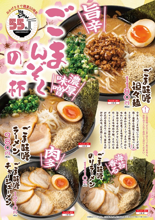 「九州筑豊ラーメン」ブランドのチェーン展開や食材の卸売りをおこなうワイエスフード株式会社(本社:福岡県田川郡香春町鏡山/代表取締役社長 小川 光久 以下、当社)は、1970年創業の「九州筑豊ラーメン」の創業55周年を記念した新メニュー企画第一弾として、期間限定商品として大好評だった「ごま味噌ラーメン」シリーズを、 春季限定商品として販売します。