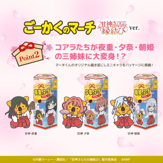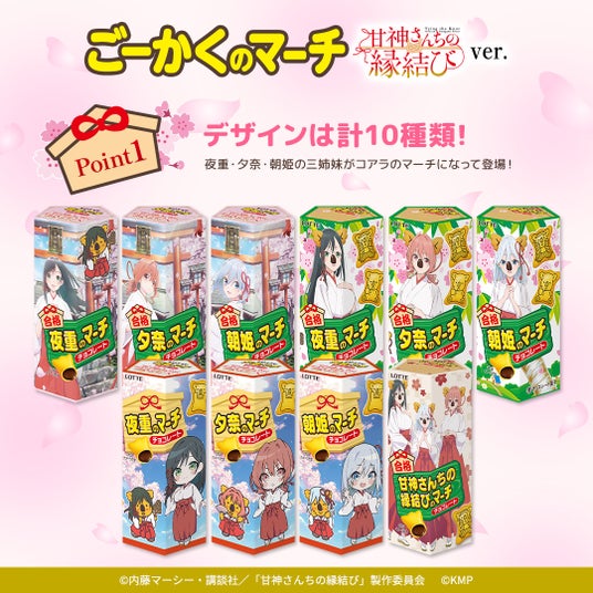 春の新生活をイメージした「ごーかくのマーチ<桜ver.>」のほか、TVアニメ『甘神さんちの縁結び』デザインの<甘神さんちの縁結びver.>も発売。ロッテオンラインショップにて、完全受注生産での販売となります。