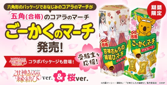 株式会社ロッテは11月11日(月)正午にロッテオンラインショップ限定で、「オリジナルコアラのマーチ」シリーズから受験を応援する気持ちを込めて「ごーかくのマーチ」を2品発売します。「コアラは寝てても木から落ちない」からと、合格祈願お菓子の定番となっているコアラのマーチ。特徴的な六角柱のパッケージを、今だけ五角(合格)柱にしました。