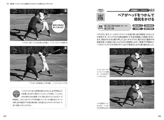 川村氏による「インサイドアウトを身につける」「スイング力を上げる」「変化球&ファウルの打ち方をつかむ」などの練習ドリル、また、数々のプロ選手のパーソナルトレーナーを務めた井脇氏はバッティングに必要な4ポイント「骨盤の使い方」「下肢の操作性」「支持機能」「胸郭と捻転差」を強化するトレーニングを紹介。すべてのトレーニングにQR動画がついているので、リアルな動きを動画で確認することができます。