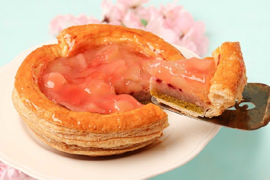 白桃さくらパイこだわりのパイ生地に、ピスタチオのジョコンド生地(緑)とさくら餡のアーモンドクリーム(桜色)を敷き焼き上げ、白桃のジャム(ピンク)を流しこんだ、春らしい色合いの美しい層を持つピーチパイです。