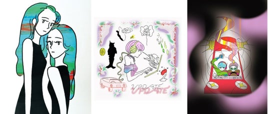 (写真左から)「SISTERS」(H600mm×W500mm / 綿・シルクスクリーン / 2022)、「アップデートしたいこと」(H300mm×W300mm / キャンバスプリント / 2023)、「ふたりで亜空間に向かうのだ」(H340mm×W330mm / キャンバスプリント / 2023)