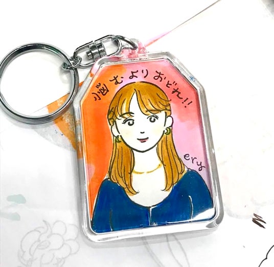 リクエストいただいたイラストにeryの一言を添えて、あなた専用のお守りキーホルダーを制作します。イラストは似顔絵やペット、好きな人の顔など、どんなものでも受け付けます。