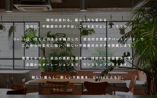 今後はunitoの価値をさらに深化させるとともに、物件数の拡充を力強く推進し、テクノロジー、マーケティング、オペレーションの全方位にわたる投資を一層加速させることで「暮らすように泊まる」をテーマにしたunitoのブランドを、より多くの方に届けてまいります。