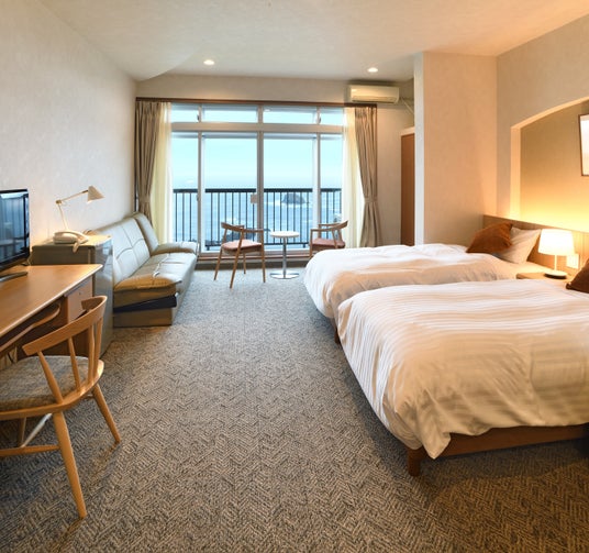 SADO二ツ亀ビューホテルは、2024年3月に客室全面リニューアル。全室海側のオーシャンビュー。シモンズ製のベッドで快適にお休みいただけます。また、テラスからは二ツ亀を前面に、夕日をみながらのカフェタイムや圧倒的な星空をお楽しみください。