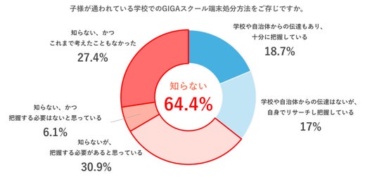 GIGAスクール端末を使用するお子様を持つ保護者のうち、約3人に2人がお子さまの通う学校でのGIGA端末の処分方法を把握していないと回答しました。GIGAスクール構想で導入された端末が2025年に更新時期のピークを迎えるにあたり、端末内の個人情報や学習データが適切に消去されないまま処分され、使っていた子どもの個人情報流出が危惧されています。そんな中、保護者が処分方法を知らないのは3人に2人に及んでおり、かつ、全体の約3割が「知らない、かつ把握する必要はないと思っている」「知らない、かつこれまで考えたこともなかった」と課題の重要性を認識していない結果となりました。