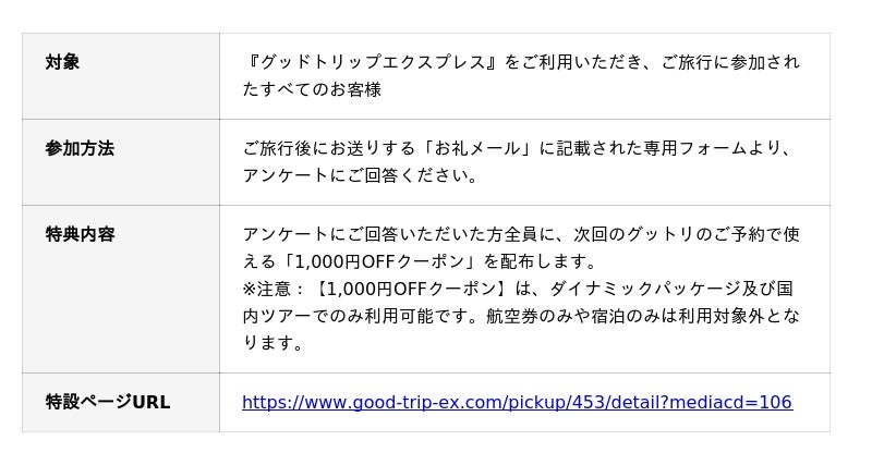 日本空輸株式会社が運営する旅行予約サイト『グッドトリップエクスプレス(通称:グットリ)』は、2026年4月9日より、サービス利用者向けのアンケートキャンペーンを開始しました。回答者全員に、次回使える1,000円OFFクーポンをプレゼントするという、旅好きには見逃せない内容です。