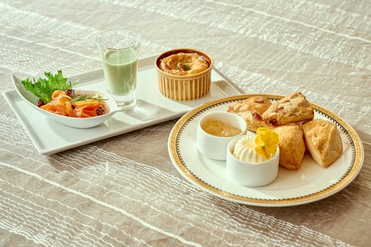 (サクサクのプレーンスコーンとクランベリースコーンに、塩クロテッドクリームとリンゴジャムを添えました。英国のティータイム気分で、ゆったり楽しんで)