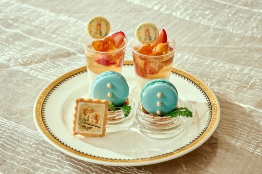 スイーツは、ピーターのブルージャケットをイメージしたマンゴー味のマカロンや、ピーターのおかあさんが優しく淹れてくれたカモミールティーの思い出をプチパフェ仕立てにしたグラスデザート、はりねずみのティギー(TM)がちょこんと休憩しているような愛らしいレモンケーキ、ピーターの従兄のベンジャミンが被ったマグレガーおじさんの帽子のムース、ピーターの妹たちが仲良く並んでいる様子を表現したピーチのムース、水辺で釣りを楽しむ蛙のジェレミー・フィッシャー(TM)のカシスタルトの6種と、作者のビアトリクス・ポター(TM)がノエル少年に絵手紙を送ったことからイメージした切手風のアイシングクッキー2種をご用意。