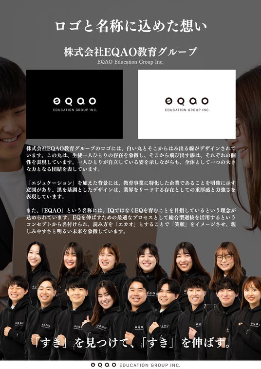 また、「EQAO」という名称には、IQではなくEQを育むことを目指しているという理念が込められています。EQを伸ばすための最適なプロセスとして総合型選抜を活用するというコンセプトから名付けられ、読み方を「エカオ」とすることで「笑顔」をイメージさせ、親しみやすさと明るい未来を象徴しています。
