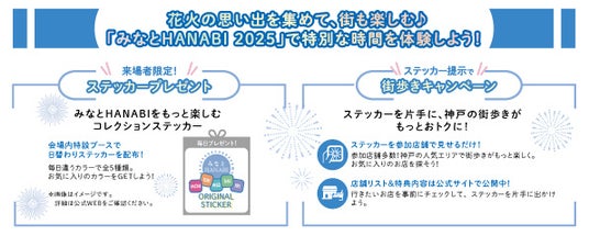 公式WEBに店舗情報を掲載して、みなとHANABI-2025-神戸を彩る5日間を一緒に盛り上げませんか? この街歩きキャンペーンは、地域連携としての開催周辺施設・店舗様の賑い創出として取り組んでおります。 ※掲載させていただくには、ステッカー提示で特典付与への参加が必須となります。 ※募集詳細についての応募先や詳しい内容は、公式WEBをご確認ください。
