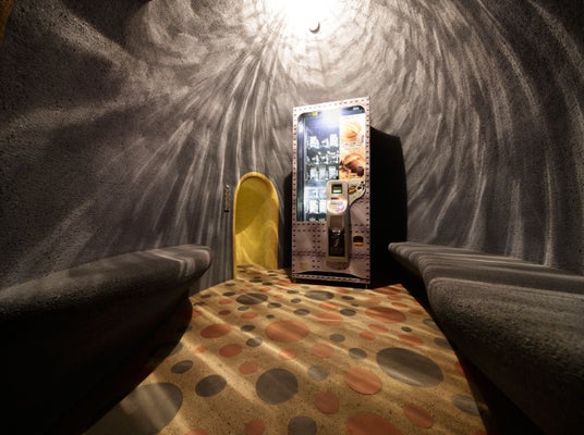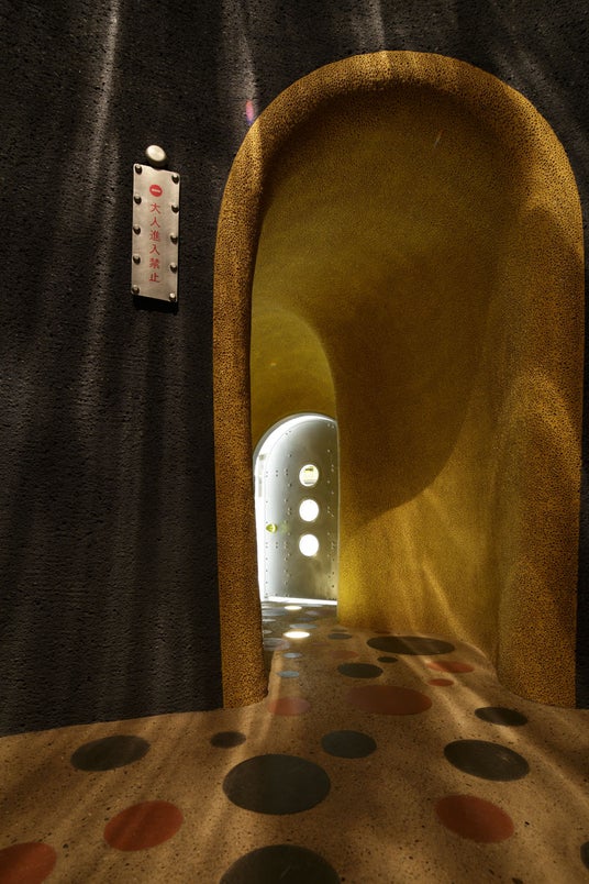 なかへ進むと「大人進入禁止」の文字とともに小さな扉が待っています。大人の方は扉の外でお待ちいただき、子どもだけの空間で楽しんで「自分で選んで買う」という経験ができます。未来製作所でしか販売していないエスコヤマのお菓子も。